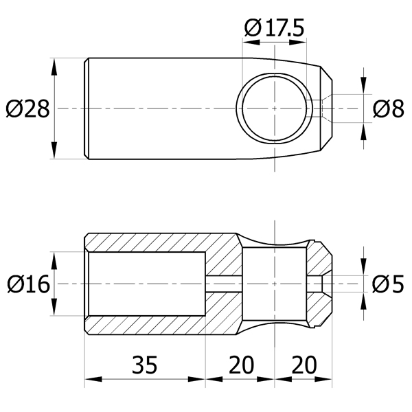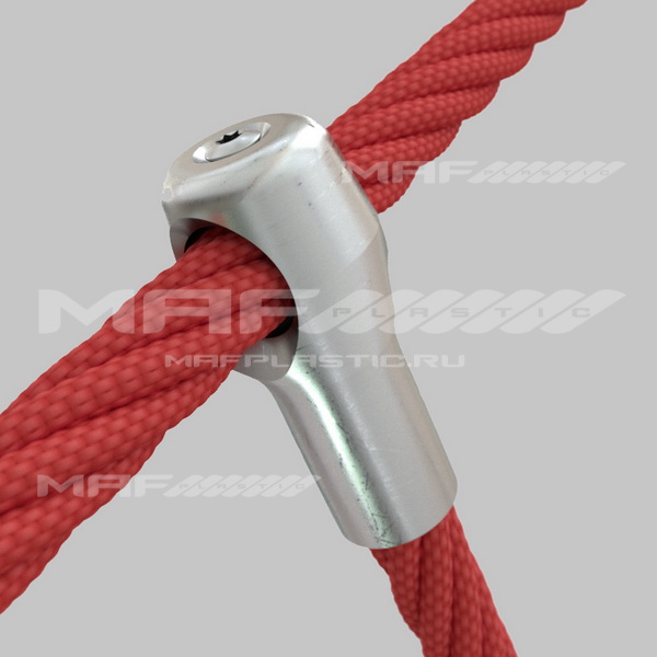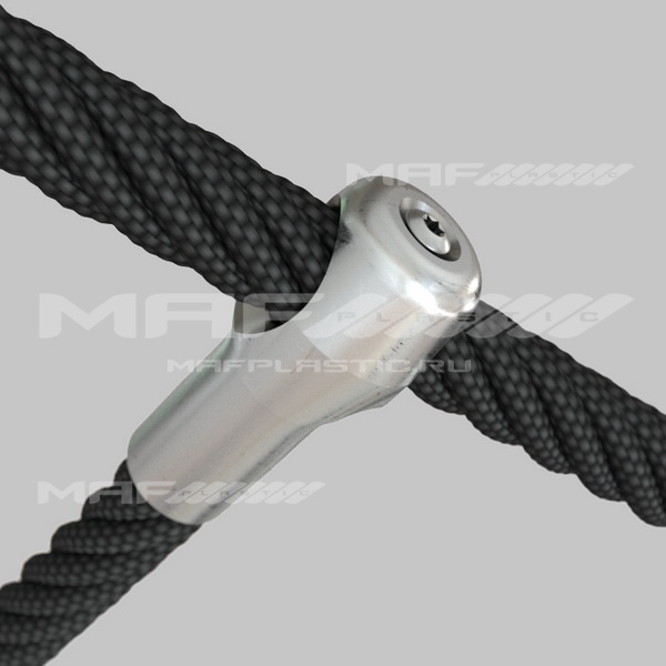 Алюминиевый Т-образный соединитель для двух канатов диаметром 16 мм. При сборке один канат крепится саморезом, второй – внутри соединителя обжимается прессом.